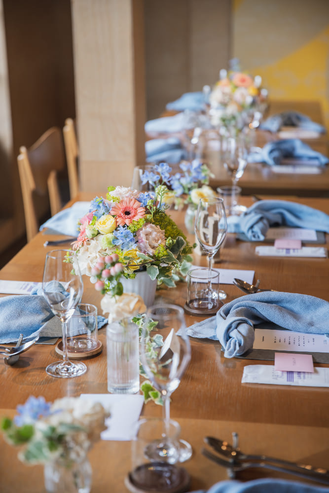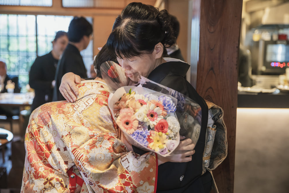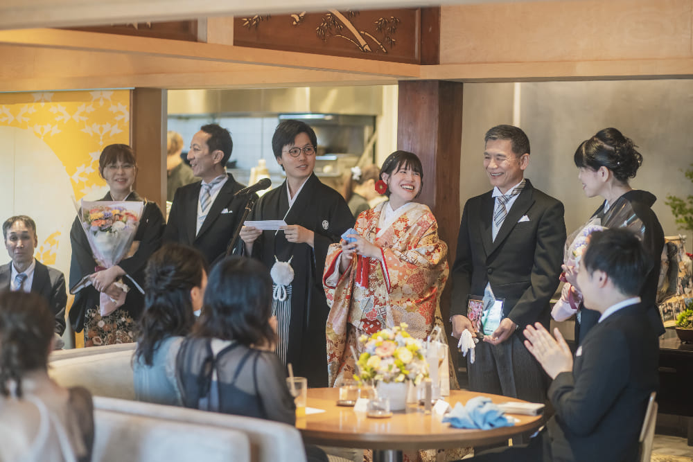 ウェルカム暖簾や盆栽など、和のテイストで会場を装飾しました。人前結婚式はタキシード&ウェディングトレスで行いましたが、大切な妹様や弟様をエスコート役に中座、お色直しの再入場は紋付羽織袴に色打掛をセレクト。フレンチレストランでの和装入場はゲストの皆さまにも大好評で、大きな歓声に包まれました!